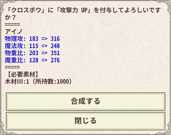 1. 合成するアイテム種にもともと付与されないものは合成できません。例えば、武器に防御力UPは合成できません。ただし同じアイテム種であっても低レベルの魔法効果は付与できるものあります。例えば防御力UPはグレードⅢまで盾にも付与できますが、Ⅳ以上は付与できません。