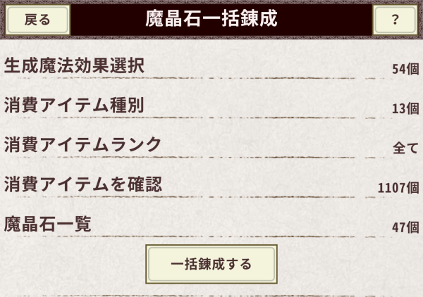 生成したい魔法効果と、消費するアイテムをそれぞれ選択することで、一括で魔晶石を錬成することができます。