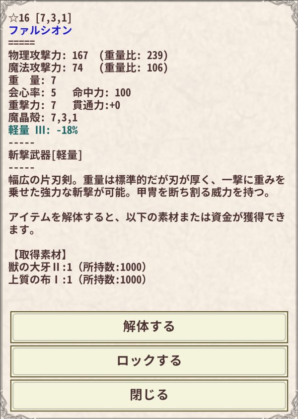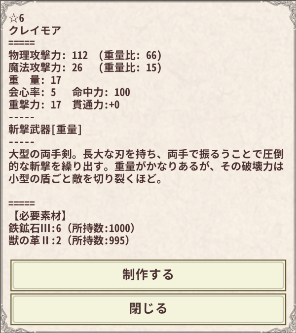 つまり、例えば☆6の重鎧が欲しい場合、同じレベルの☆6の剣や槍、兜などを解体して素材を回収し、それをもとに制作する、ということが可能です。