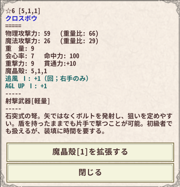 例えば、魔晶殻5-1-1のアイテムの場合は、魔晶石(魔法効果)Ⅴの効果が一つと、Ⅰの効果が2つ付与可能であることを示します。