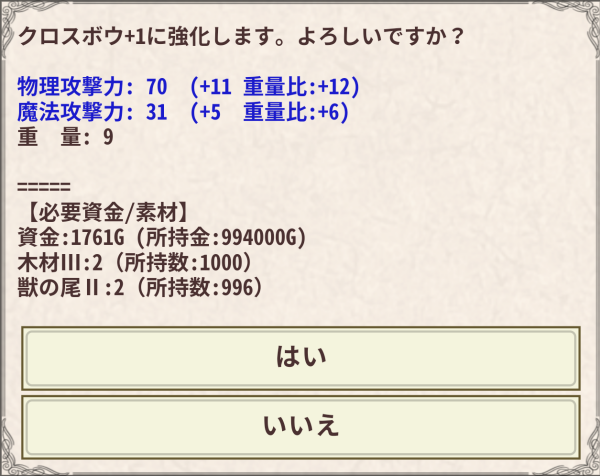 素材を消費してアイテムレベルを向上させることができます。アイテムレベルが上がると基礎性能が上がり、より強力なアイテムになります。アイテムごとのレベル上限に違いはなく、低ランクのショートソードでも後半に登場する最高ランクのアイテムに並ぶ性能まで鍛え上げることが可能です。
